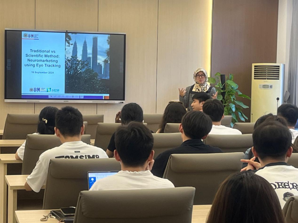 报告中,Salmi Mohd Isa博士分析了传统研究方法与科学研究方法的区别,帮助与会者更好地理解两者在实际应用中的不同,全面介绍了神经营销的概念,探讨了如何将神经科学方法应用于市场营销研究中,以分析消费者的神经反应并预测其决策行为。此外,报告还详细介绍了眼动追踪技术的基本原理,并阐述了这一技术如何通过捕捉消费者眼睛的移动轨迹,分析消费者的注意力焦点、视觉关注点以及信息处理方式。Salmi博士通过实例展示了眼动追踪技术在神经营销中的应用价值,激发了与会者对该技术在营销策略中的潜在应用兴趣。报告最后,Salmi博士与在场师生分享了如何使用眼动追踪技术进行数据收集的实践经验。